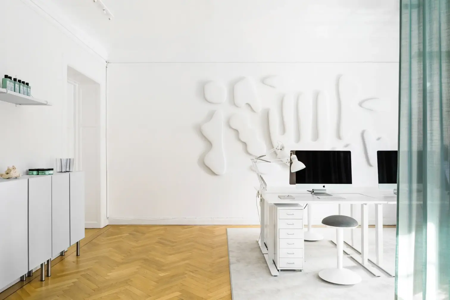 When the freshly started architectural firm ASKA took on the project of designing the new head quarter for the professional hair care brand Maria Nila, they both wanted to create something truly unique, with attention to smallest detail and making the core of the brand with its vegan origin ooze. With inspiration from organic forms and soft natural colors. Big Image was called in for turning some of the most important details into reality like the art installation in the entrance and the coral reef inspired acoustical solution.